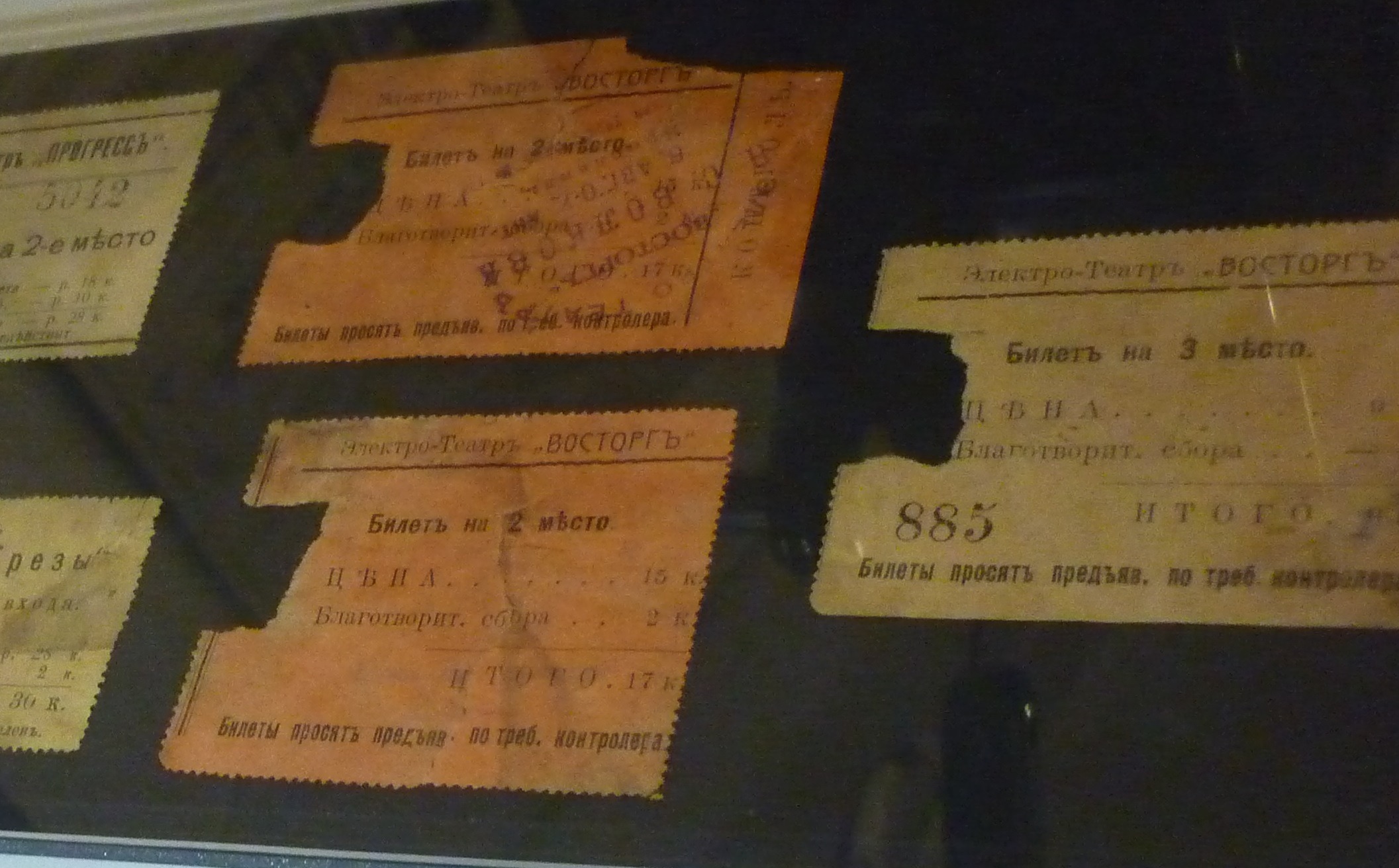 Кинематограф – вид массового искусства и предметов этой культуры сохранилось мало. На выставке представлен единственный сохранившийся входной билет в электротеатр. Среди экспонатов – кинопроектор «Сименс» первой трети X